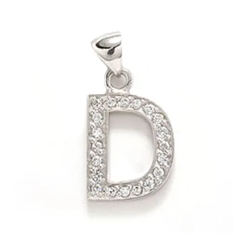 d-kirjain riipus hopeaa kiiltävä pinta ja 20 viistehiottua valkoista zirkonia.