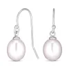 7-7,5 mm helmikorvakorut i rodinoitua hopeaa kanssa kiiltävä pinta ja 2 laventelinväristä makeanveden helmeä.