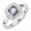 neliskulmainen lila zirkoni sormus hopeaa kiiltävä pinta 1 viistehiottua lilaa zirkonia ja viistehiottu valkoinen zirkoni.