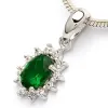 ruusukeriipus hopeaa kiiltävä pinta ja 12 viistehiottua valkoista zirkonia ja 1 viistehiottua vihreää zirkonia.